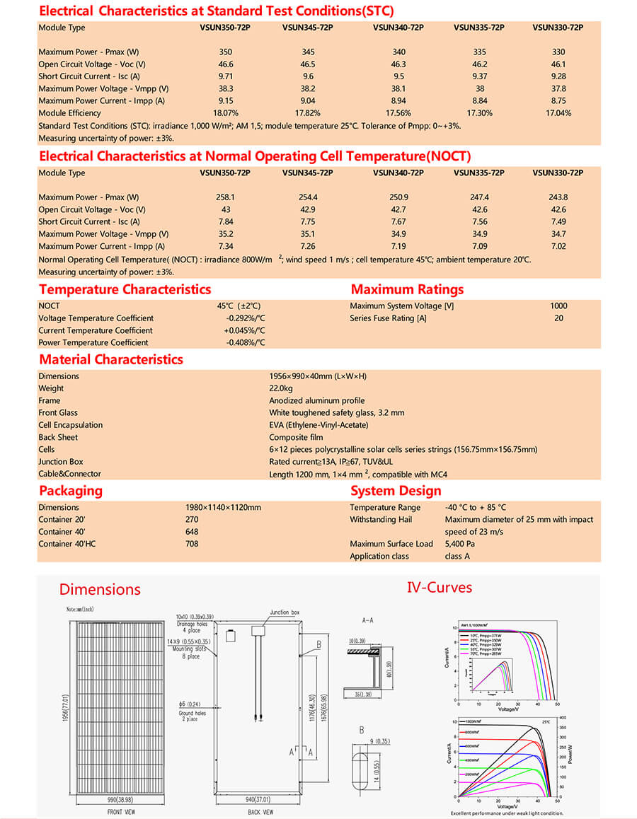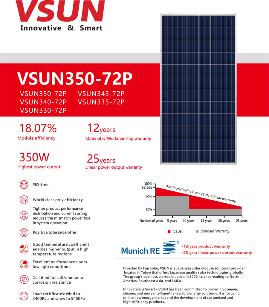 Tấm pinnăng lượng mặt trời Poly VSUN 340W-72P đáp ứng tiêu chuẩn chất lượng nghiêm ngặt của IEC, CE, TUV. Bảo hành hiệu suất 25 năm để đảm bảo hiệu suất tối đa cho hiệu quả hệ thống cao nhất. Các tính năng chính của sản phẩm: