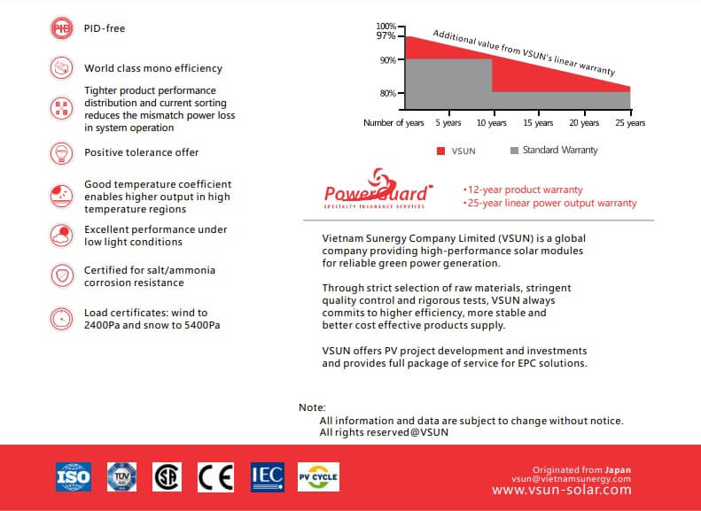Tấm pin năng lượng mặt trời VSUN 370W-72M Mono PERC là sản phẩm của VSUN. Công ty có vốn đầu tư 100% từ tập đoàn Fuji Solar của Nhật – một nhà đầu tư có tiếng trong lĩnh vực năng lượng mặt trời. Fuji Solar cung cấp giải pháp năng lượng mặt trời toàn diện cho khách hàng với kinh nghiệm thực tiễn trong suốt quá trình phát triển của ngành năng lượng mặt trời.